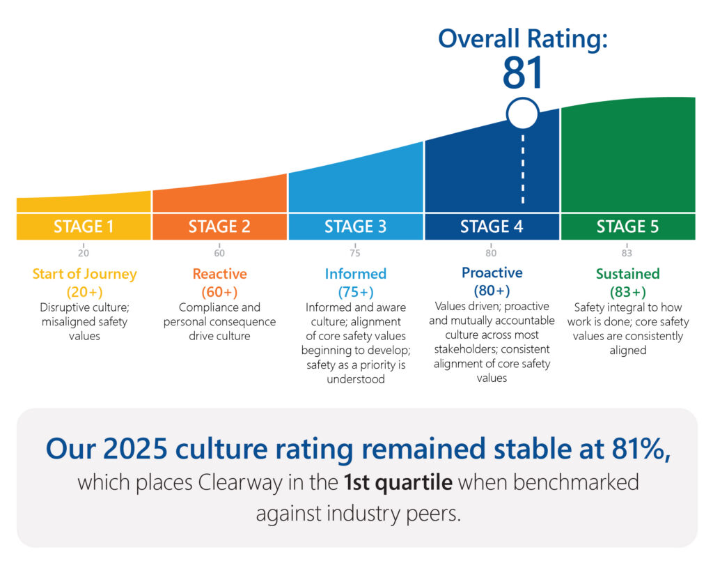 Our 2025 culture rating remained stable at 81%, which places Clearway in the 1st quartile when benchmarked against industry peers.